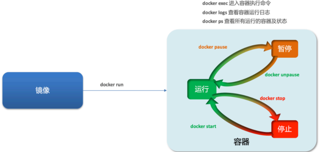 docker run:创建并运行一个容器,处于运行状态docker pause:暂停一个正在运行的容器docker unpause:让一个容器从暂停状态恢复运行docker stop:停止一个运行的容器docker start:让一个停止的容器再次运行docker rm:删除一个容器docker ps:查看正在运行的容器docker ps -a:查看所有状态下的容器docker logs:查看一个容器的运行日志