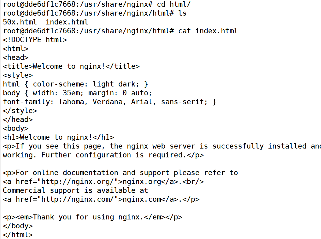 由于容器内没有vi命令,这里无法之间进行修改,请看下一小节1.4数据卷(容器数据管理)