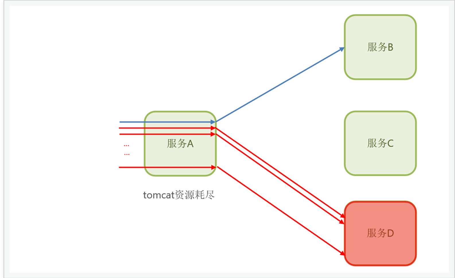 上图:此时所有请求 D 服务的都会被搁置,占⽤ tomcat 资源,当达到⼀定数量之后 tomcat 资源也随之耗尽
