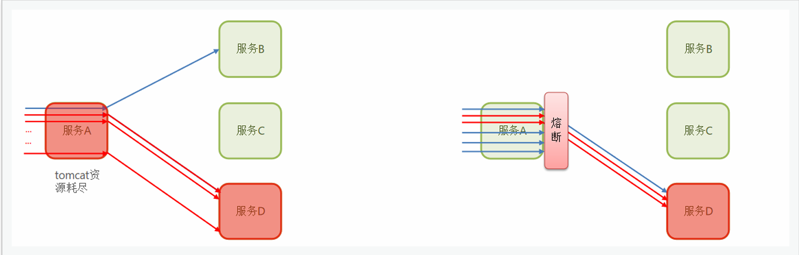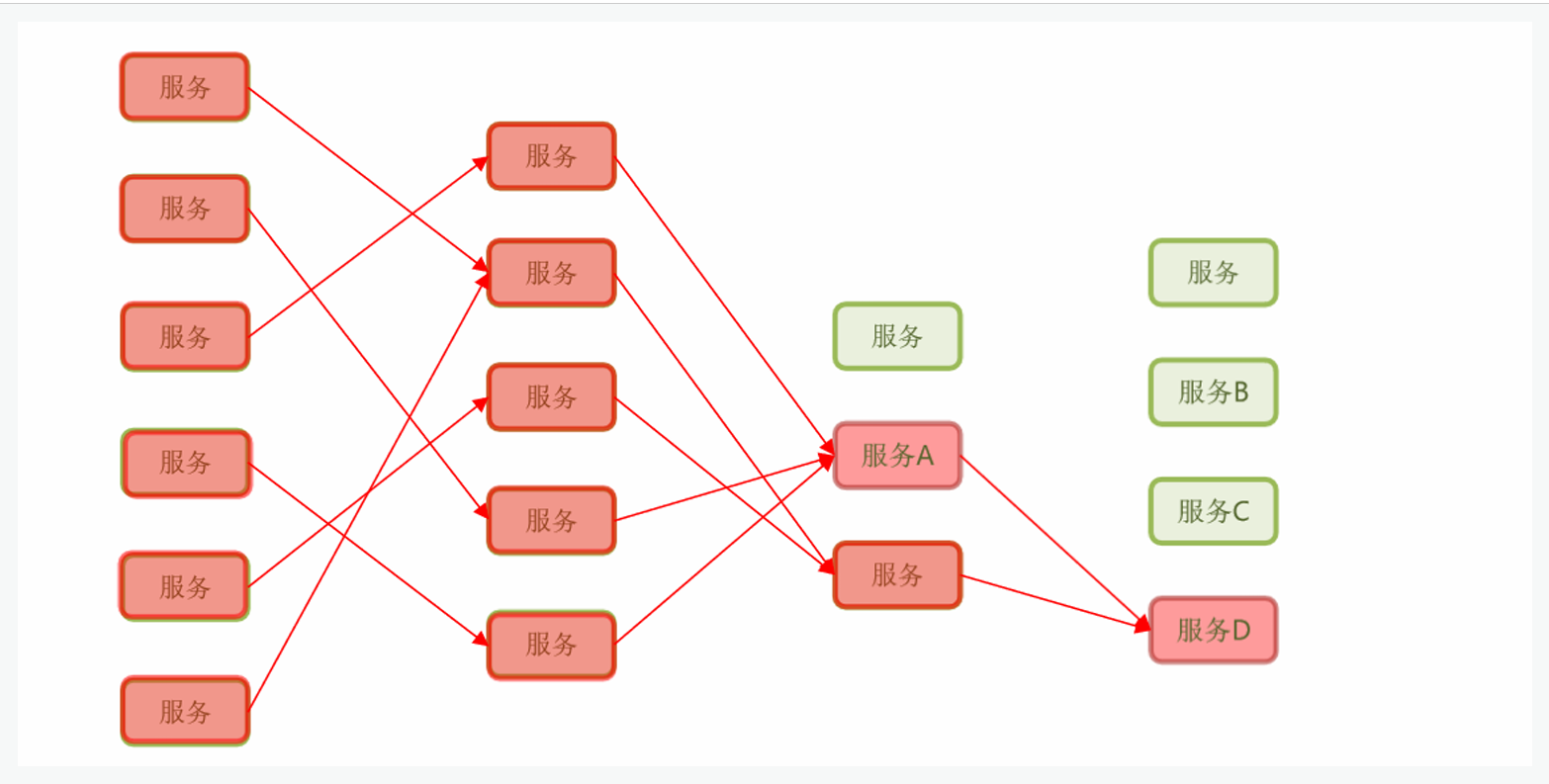 上图: 有 D 引发 A ,由 A ⼜引发其他⼀系列相关的服务出现故障,这就是微服务的雪崩。