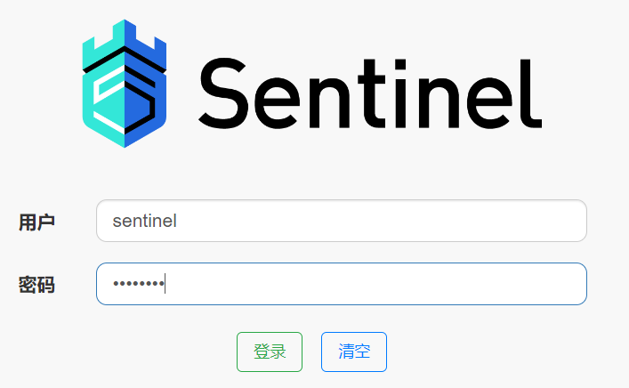 然后访问: localhost:8080 即可看到控制台⻚⾯,默认的账⼾和密码都是 sentinel