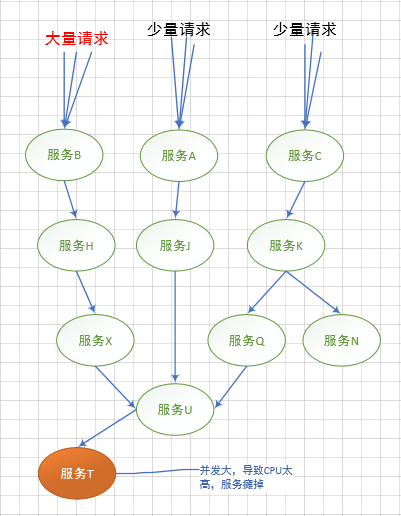 导致服务U和服务T的负载过高。运行性能下降。会导致其他调用服务U和服务T的链条出现问题。从而所有的项目可能都出现的问题。