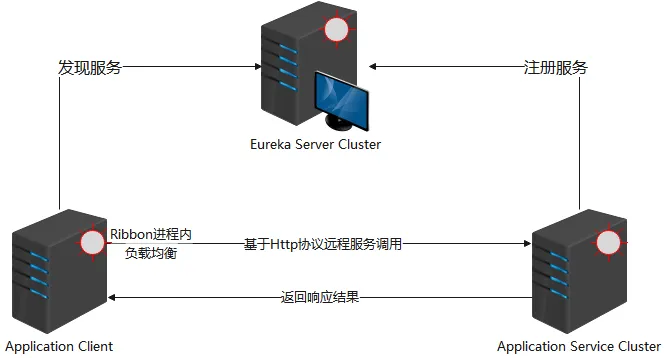 四、基于Ribbon测试负载均衡1****说明 上面的案例中,我们搭建好了Eureka Server,可以让各种服务进行注册; 搭建好了application service的集群,有3个节点的集群,要求他们的application name必须一样。 接下来我们创建一个application client,让它从Eureka Server上获取到application service的信息列表,然后通过Ribbon的负载均衡从获取到的application service的信息列表中选择一个我们要调用的! 但是我们先不调用application service,因为目前我们还没有学习通过什么工具调用!