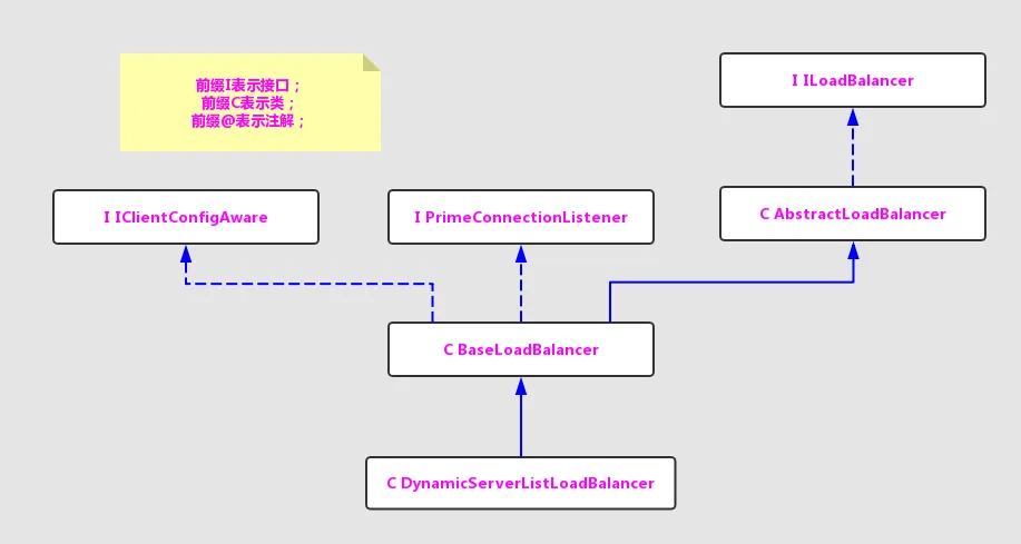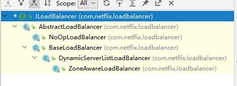 所有的微服务项目都会注册到Eureka Server中,Eureka Server允许不同项目的应用名称即spring.application.name是相同。当应用名称相同时会认定这些项目是一个集群。所以部署集群时都是设置相应的应用程序相同的应用名称。 Application Client会从Eureka Server中根据spring.application.name加载Application Service的列表。根据设定的负载均衡算法,从列表中取出一个合适的URL,到此Ribbon的事情结束了。剩下的事情由程序员自己进行技术选型,选择一个HTTP协议工具(如:RestTemplate、OkHttp、HttpClient等),通过这个URL远程调用Application Service服务。 注意:以下事情和Ribbon是没有关系的 Application Service注册到Eureka Server的过程。这是Eureka Client的功能。 Application Client从Eureka Server中发现注册列表。这是Eureka Client的功能。 Application Client通过URL远程访问Application Service。具体实现可以自己进行选择使用哪个HTTP工具。 只有Application Client从Eureka Server中发现服务后进行负载均衡算法的过程和Ribbon有关系。 2.2****负载均衡器继承关系 LoadBalancer 负载均衡的意思,简称LB