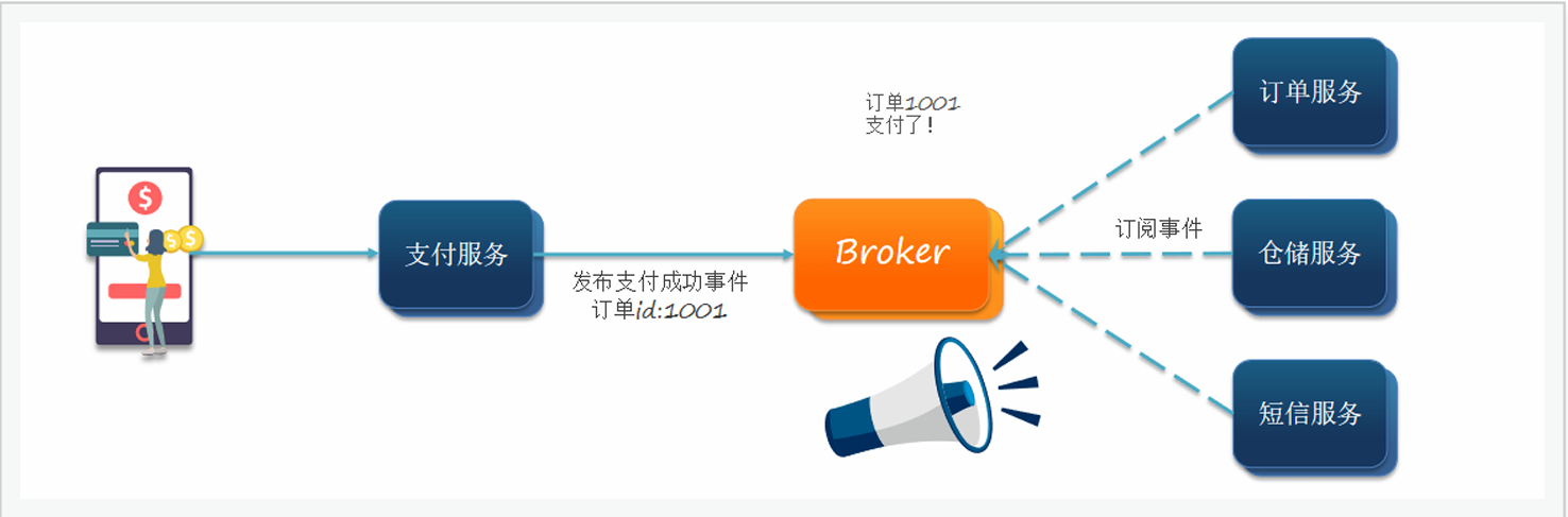 在事件模式中,⽀付服务是事件发布者( publisher ),在⽀付完成后只需要发布⼀个⽀付成功的事件( event ),事 件中带上订单 id 。 订单服务和物流服务是事件订阅者( Consumer ),订阅⽀付成功的事件,监听到事件后完成⾃⼰业务即可。