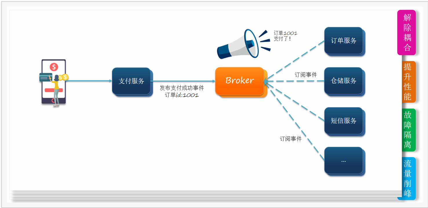 故障隔离:服务没有直接调⽤,不存在级联失败问题 调⽤间没有阻塞,不会造成⽆效的资源占⽤