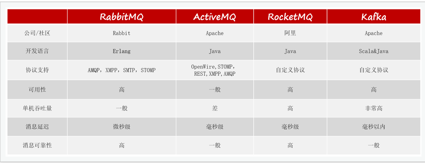 追求可⽤性: Kafka 、 RocketMQ 、 RabbitMQ 追求可靠性: RabbitMQ 、 RocketMQ 追求吞吐能⼒: RocketMQ 、 Kafka 追求消息低延迟: RabbitMQ 、 Kafka