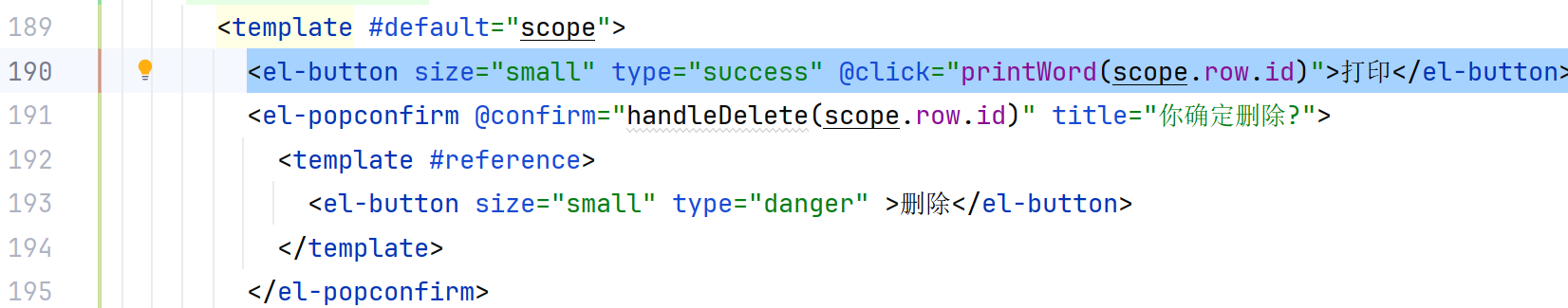 (2)在删除代码上方添加一个打印的按钮,并且添加点击事件将id传到后端